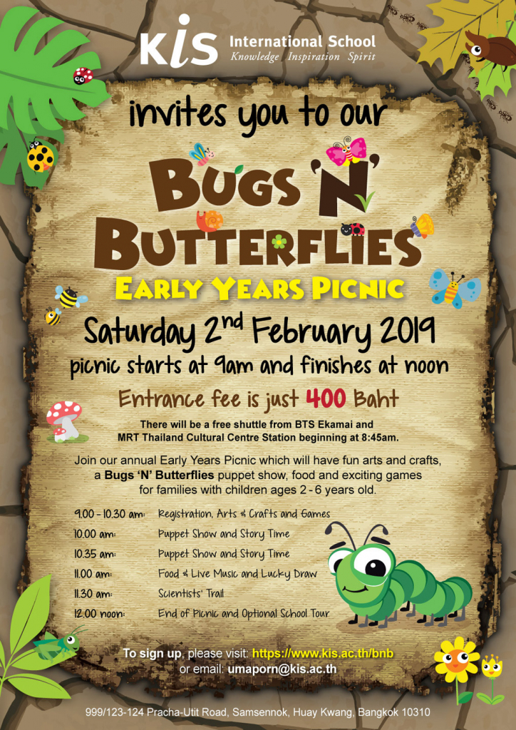 Families with young children are invited to join a morning of Bugs and Butterflies themed fun and games at KIS’s Bugs n Butterflies Picnic on Saturday February 2, 2019.