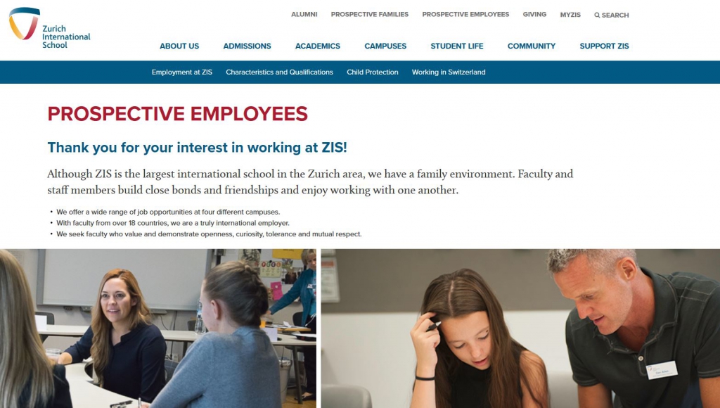 Recruiting good teachers is just as critical as attracting students: prospective staff and faculty go to your website, so why not provide the information they are looking for to make sure that is also a good fit? Zurich International School recently launched their new site and made great efforts to optimize their recruiting efforts. We have found that schools that showcase their school more accurately and in greater detail are able to streamline their recruitment process as well as make better use of their time at recruitment fairs.