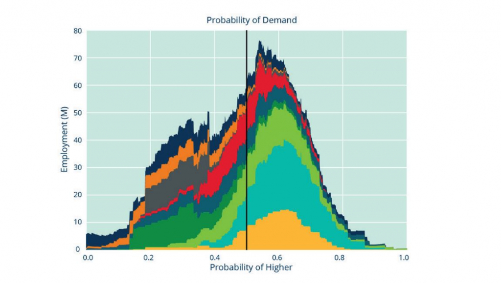 First, let's look at our predictions about employment. The below graph shows the results of thousands of simulations predicting that a specific occupation will employ more (or less) than it does today. The x-axis estimates the probability that each occupation group will experience higher relative demand and the y-axis shows the number of predicted jobs in that occupation for each simulation. Thus the areas on the right of the distribution are occupations where we expect rising demand; those on the left are expected to decline.